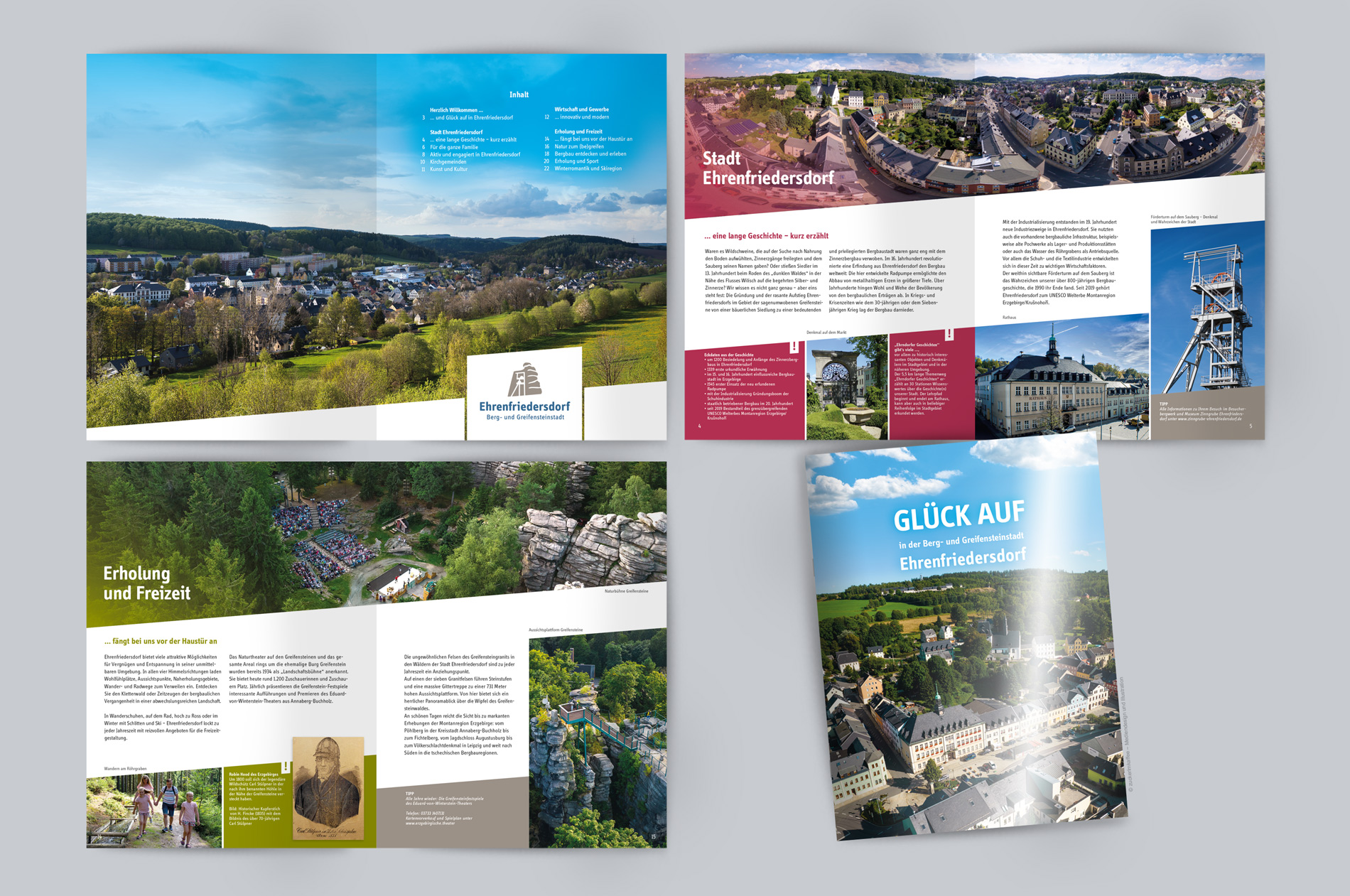 Als Gestaltungsmittel des Corporate Designs kommen ansteigende grafische Flächen zum Einsatz. Sie stellen den in der Region typischen bergigen Anstieg dar. Aus diesen erheben sich vereinzelt Bilder oder Infoboxen zur Abbildung und Information. Diese Art der Umsetzung ist ähnlich der pilzartigen Herauslösung der Greifensteine im Landschaftsbild. Eine Farbgliederung für die Bereiche Stadt (rot), Natur und Tourismus (grün) sowie Wirtschaft (blau) erscheint erstmalig im Broschürdesign.