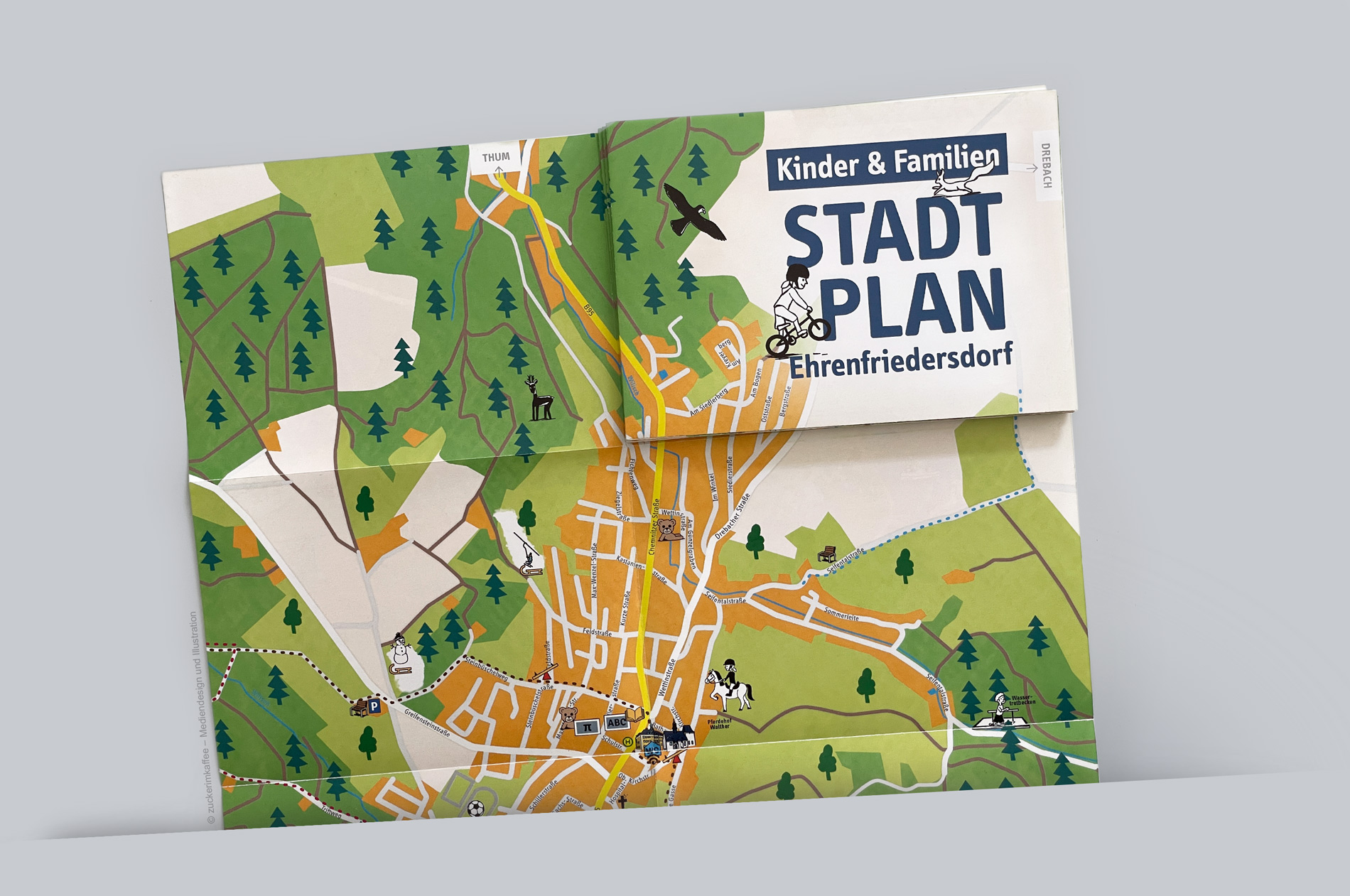Die Region Ehrenfriedersdorf hat viel zu bieten. Im handlichen Taschenformat werden in einem farbenfroh illustrierten Stadtplan die Hotspots der Stadt, die Wanderwege der nahen Region sowie Erlebnispunkte gezeigt. So findet sich beispielsweise im Waldgebiet auch der Weihnachtsmannbriefkasten.