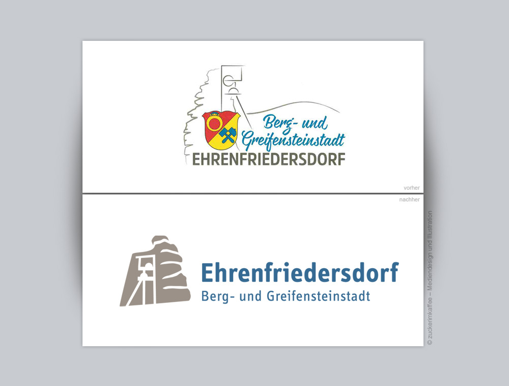 Die Stadt Ehrenfriedersdorf hat sich für ein neues Logo entschieden. Großer Wert wurde auf die Trennung von Stadtlogo und Stadtwappen gelegt. Das Logo dient der übergreifenden Kommunikation der Stadt. Es löst das alte kleinteilige Logo, welches aus zu vielen Elementen besteht ab. Das historische Stadtwappen bleibt erhalten und wird weiterhin bei der Kommunikation hoheitlicher Ausübungen verwendet.