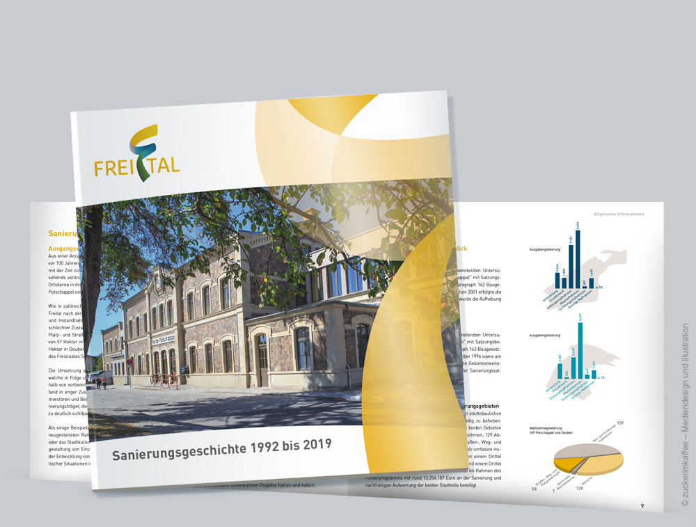 Ideal für Sammler der Stadtgeschichte. Hier entstehen Dokumentationen über die Sanierungsgeschichte in gedruckter Form. Die Gestaltung kann sich am Corporate Design orientieren oder als Neugestaltung zur Umsetzung kommen. Wichtig ist die anschauliche Darstellung der Sanierungsvorhaben. Dies kann mit Gegenüberstellung von alt und neu, anhand von Informationsgrafiken oder Architekturfotografien erfolgen.