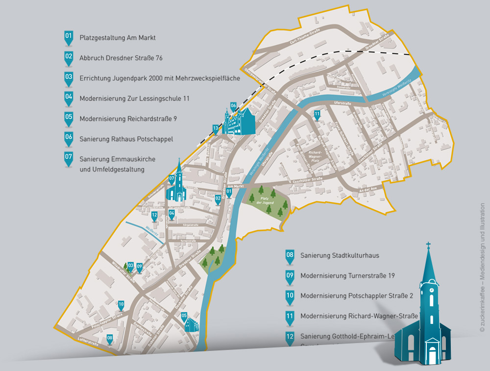 Bei vielen Bauvorhaben verliert man schnell den Überblick. Mit einer speziell zum Fördergebiet illustrierten Karte ist Abhilfe geschaffen. Die einzelnen POIs lassen sich abbilden und bei besonderen Gebäuden ist die Darstellung als illustrierte Grafik möglich.